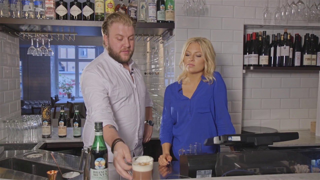 Alex visar Sanna hur man enkelt gör en drink med Brancamenta och varm choklad.
