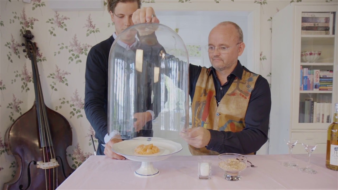 Mats och Niclas minutröker lax med alspån. Laxen provas sen tillsammans med Herrgårds Akvavit.